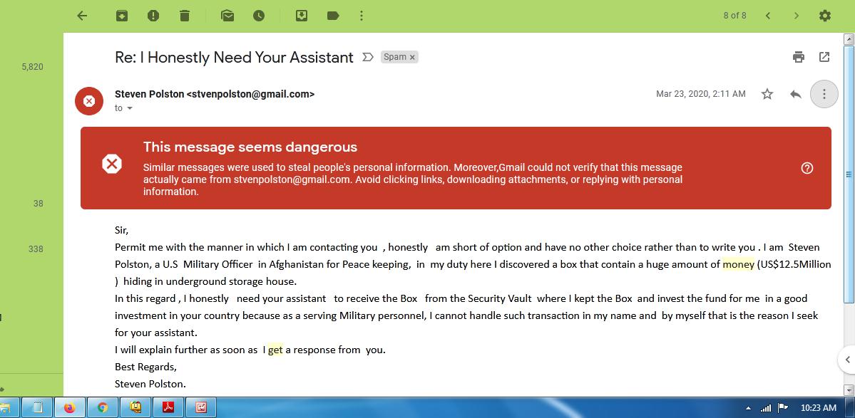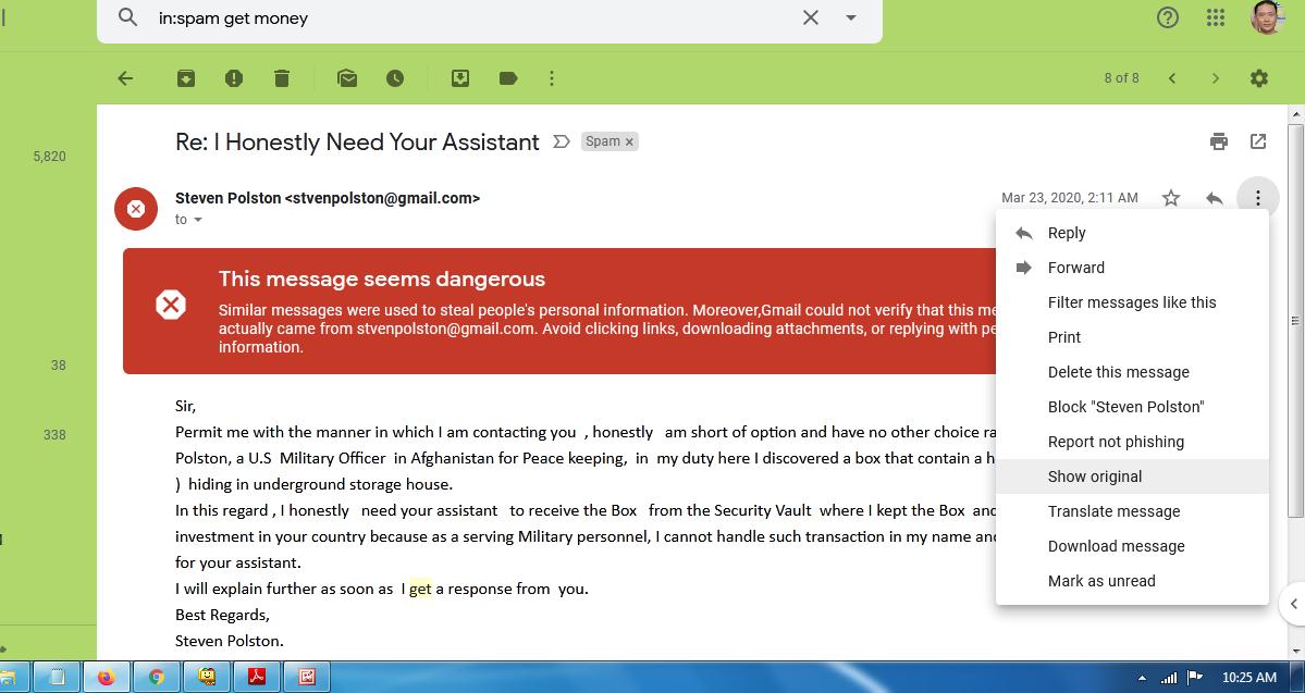 Google sebenarnya telah pintar dalam memilih dan melakukan filtering email masuk. Biasanya, email yang terindikasi spoofing akan masuk ke kategori spam atau muncul notifikasi This message seems dangerous. Artinya, email ini terindikasi tidak aman.