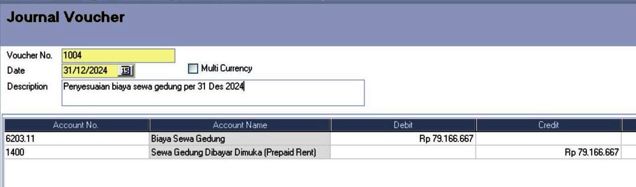 Setelah jurnal penyesuaian diposting, akun Biaya Sewa akan bertambah sebesar Rp 79.166.667, dan akun Uang Muka Sewa akan berkurang sebesar Rp 79.166.667. Ini mencerminkan biaya sewa yang telah digunakan selama periode 15 Maret 2024 hingga 31 Desember 2024.